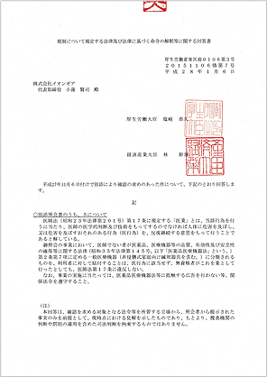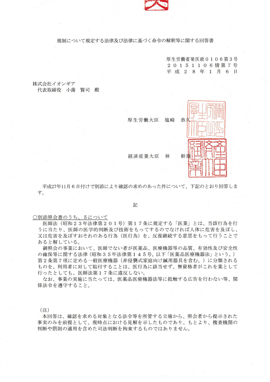 当社のイオンギア™シリーズは、厚生労働省および経済産業省から『医師以外の者が、業として利用者に貼付する行為は、医師法に規定する「医業」に該当するものではない。』という判断を頂戴しております。